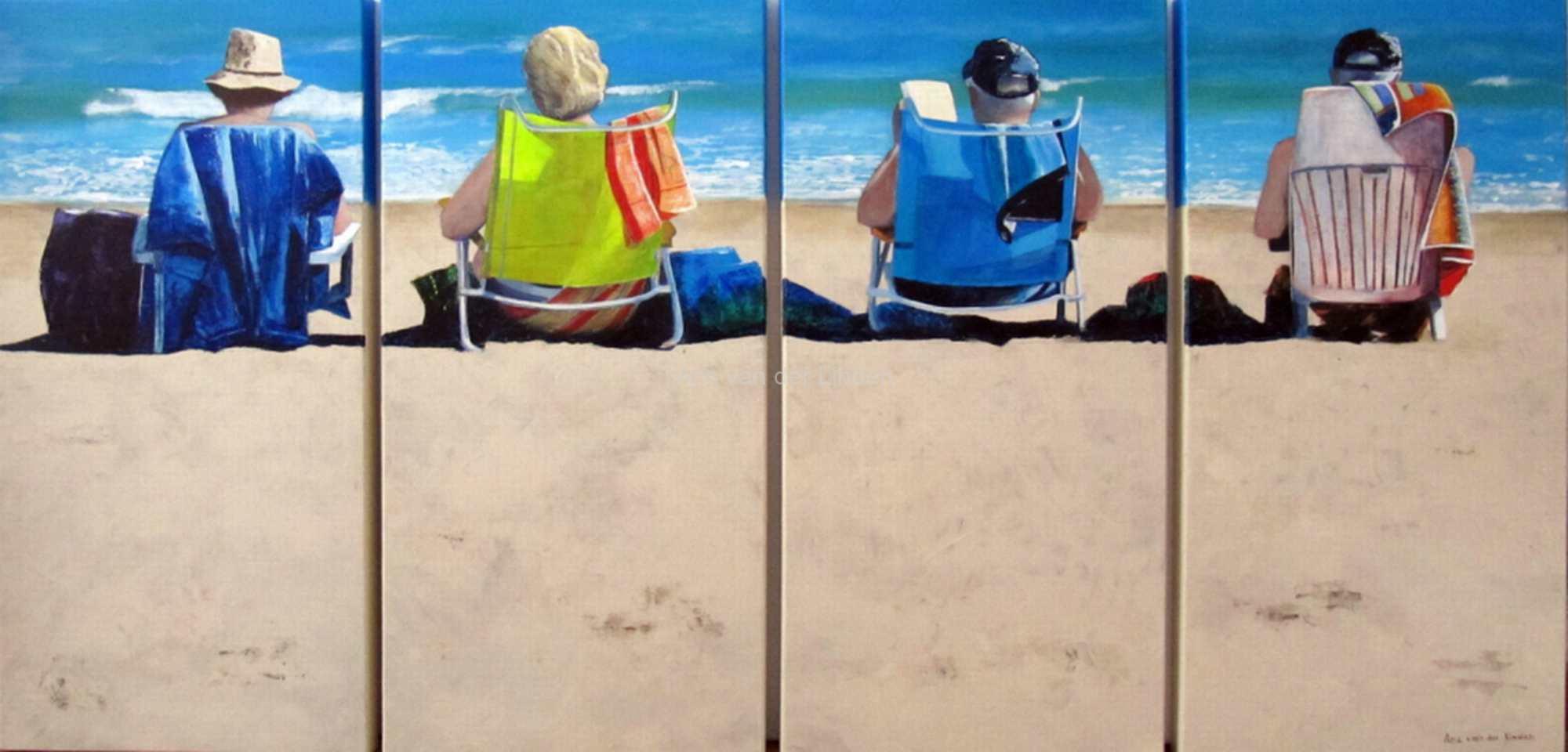 Vier mensen, twee vrouwen en twee mannen genieten van de zon op de eerste rang van het strand.